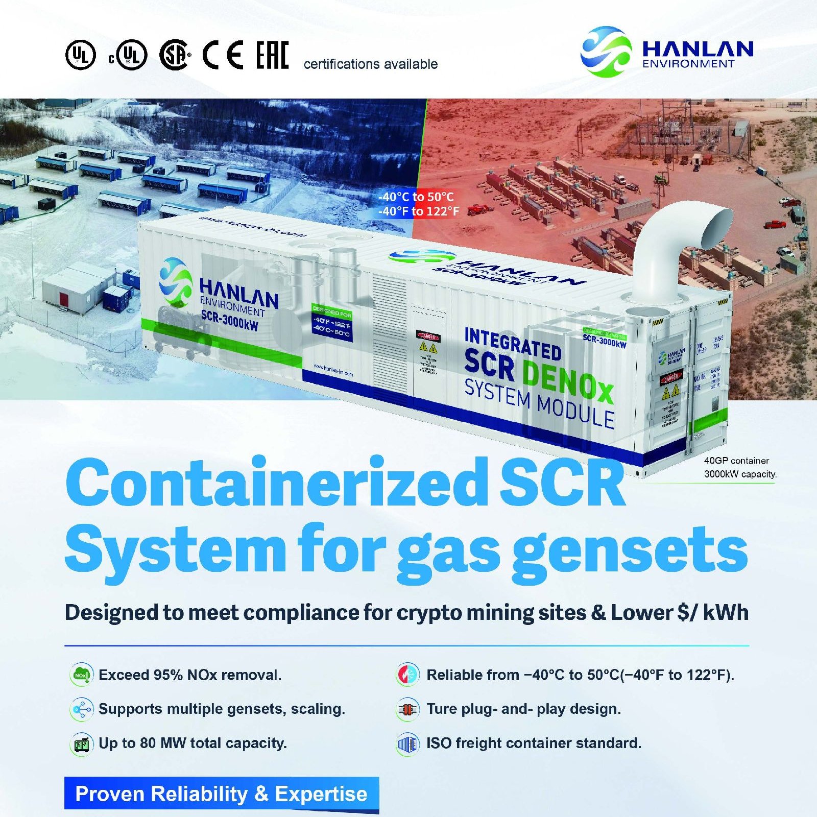 1托n组合式设计:1套SCR服务1-n台发电机组,减少设备数量50%,空间占用降低40%零运输附加成本:集成式SCR脱硝装置符合国际集装箱运输标准,海运/陆运即装即走,海运成本降低70%以上;